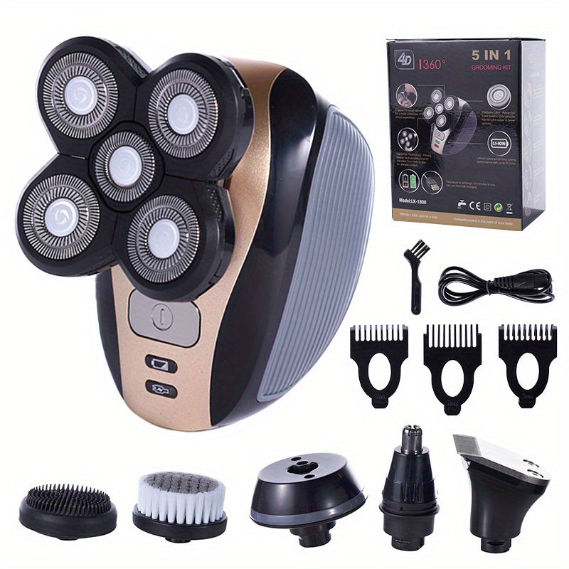 5-in-1 Electric Shaver for Men: Bald Head Polish, Hair Clipper, Trimmer, Floating 5 Blade Heads & Rechargeable Razors!